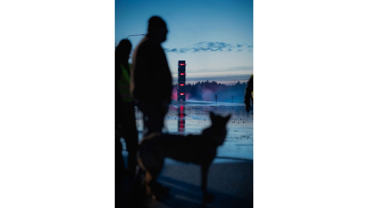 The film was shot in late 2019 on a testing ground outside Volvo’s hometown of Gothenburg, Sweden. Both the truck tower and the majority of the visual effects are real, including the smoke and lights, which a behind-the-scenes film reveals.